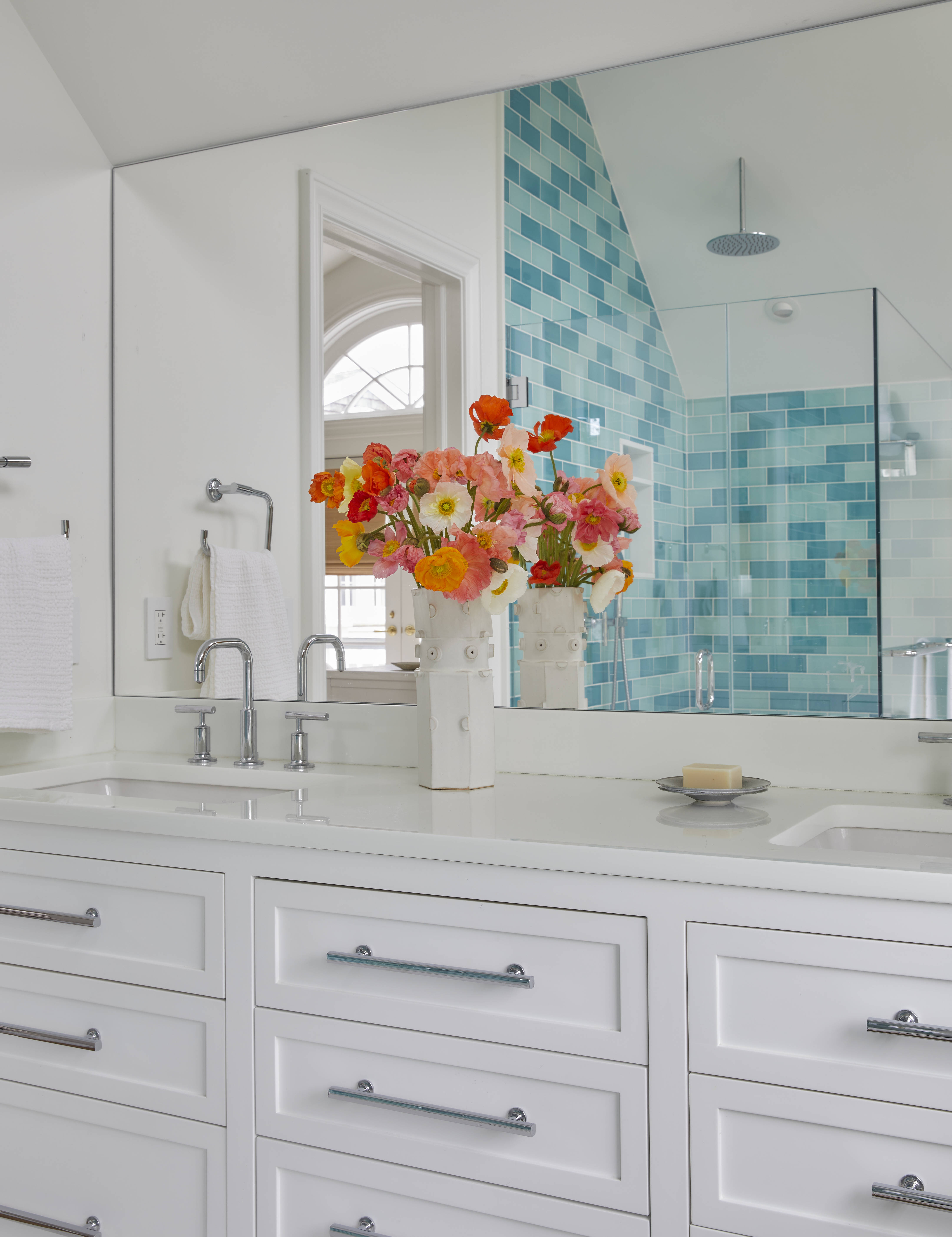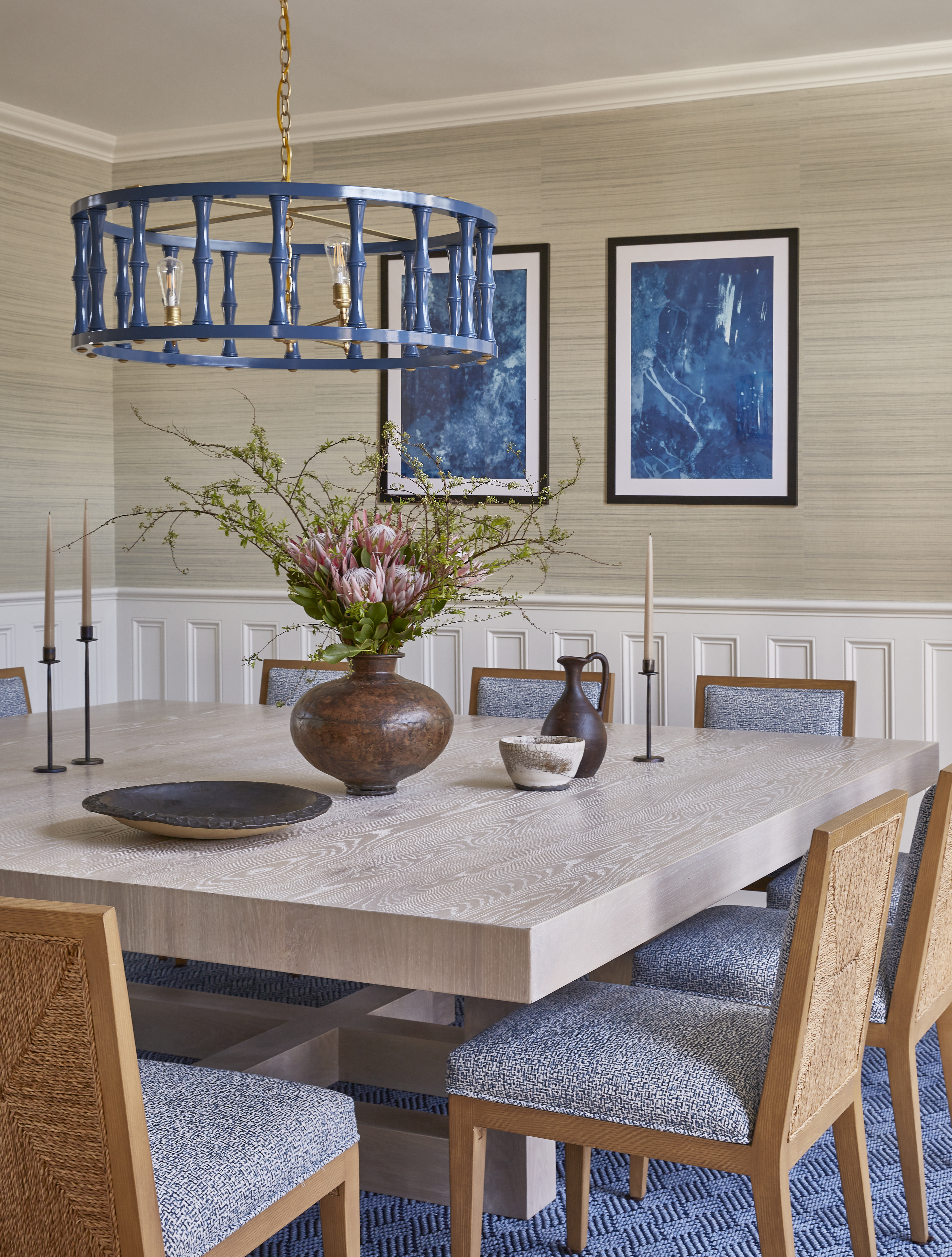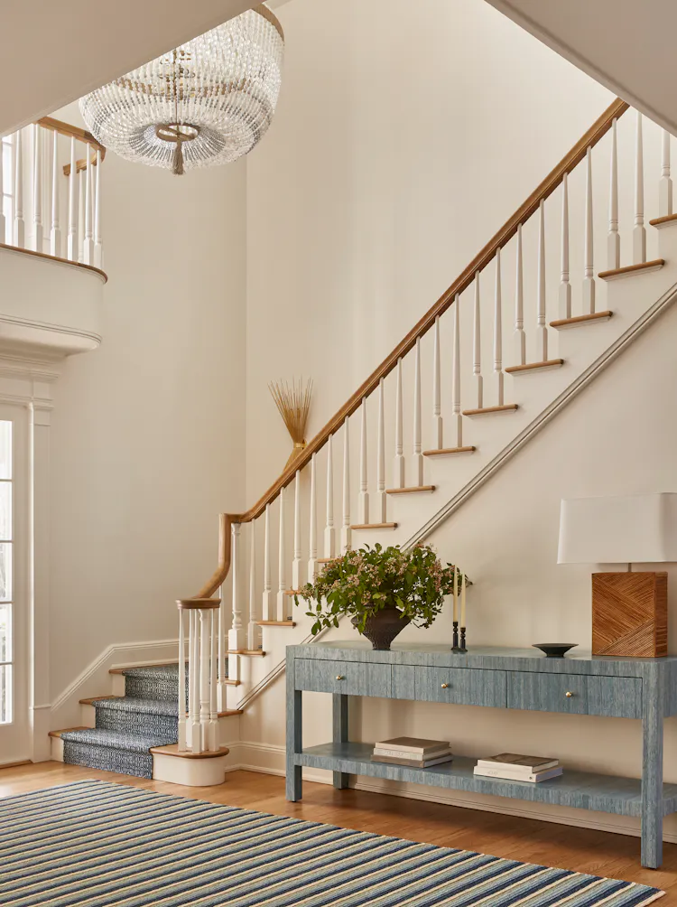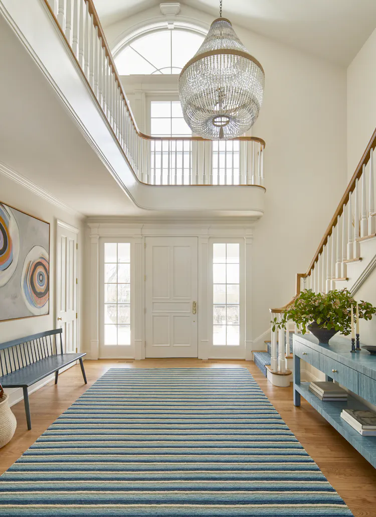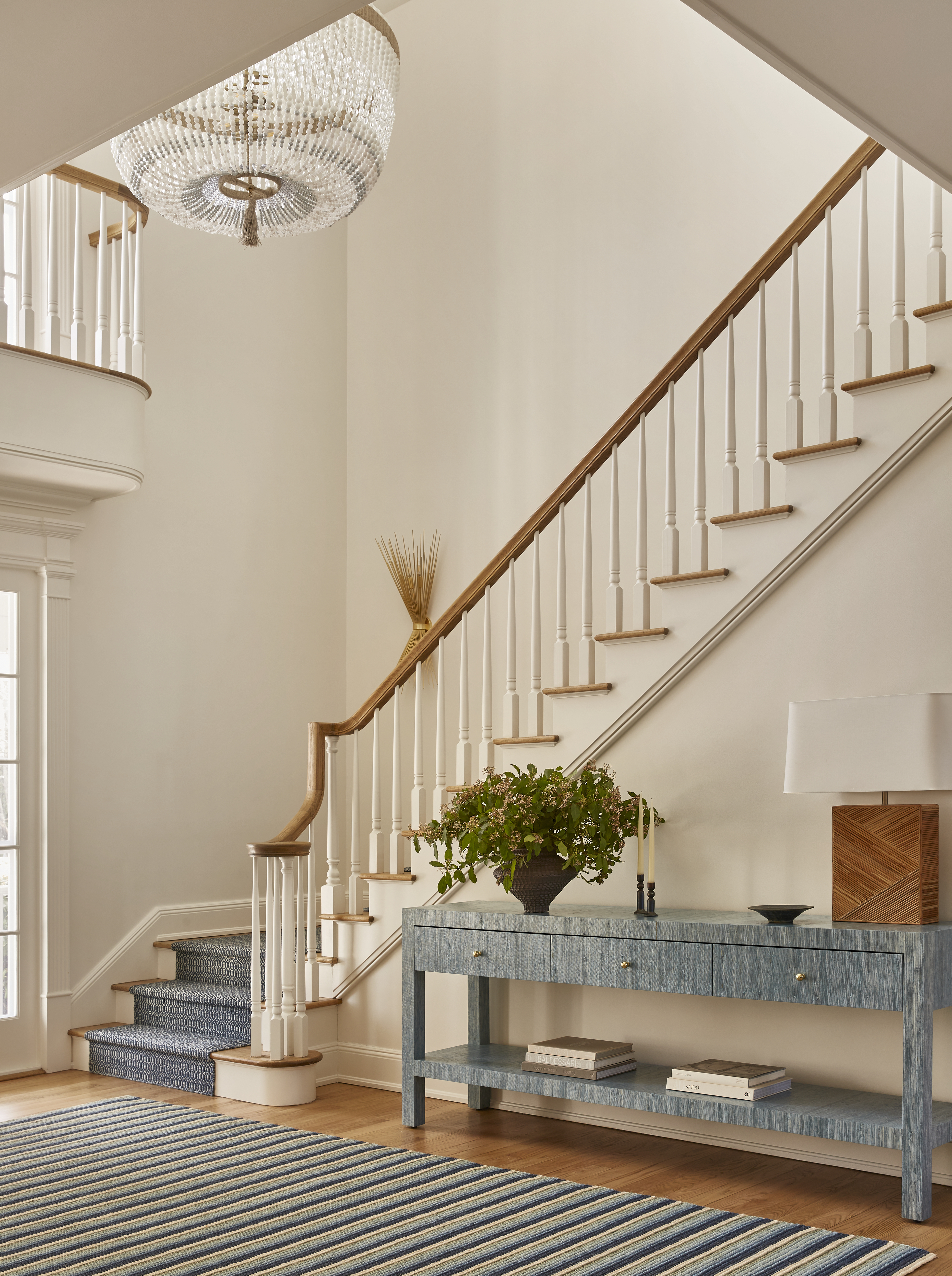 K.A. Murphy Interiors created a summer sanctuary for a West Coast family seeking a permanent home base in the Hamptons for gatherings with their whole family. Designed to host multiple generations, the home balances serenity and function, with standout features including a custom 12-seat cerused oak dining table, an octagonal lounge and custom sofa, and a cheerful bunkroom with built-in beds and playful tiles. From the grand foyer with its bold custom rug to the wraparound porch and statement fixtures, every detail was chosen to bring people together. The result is an elegant yet welcoming escape: an airy, light-filled haven designed for summers of connection and lasting memories.